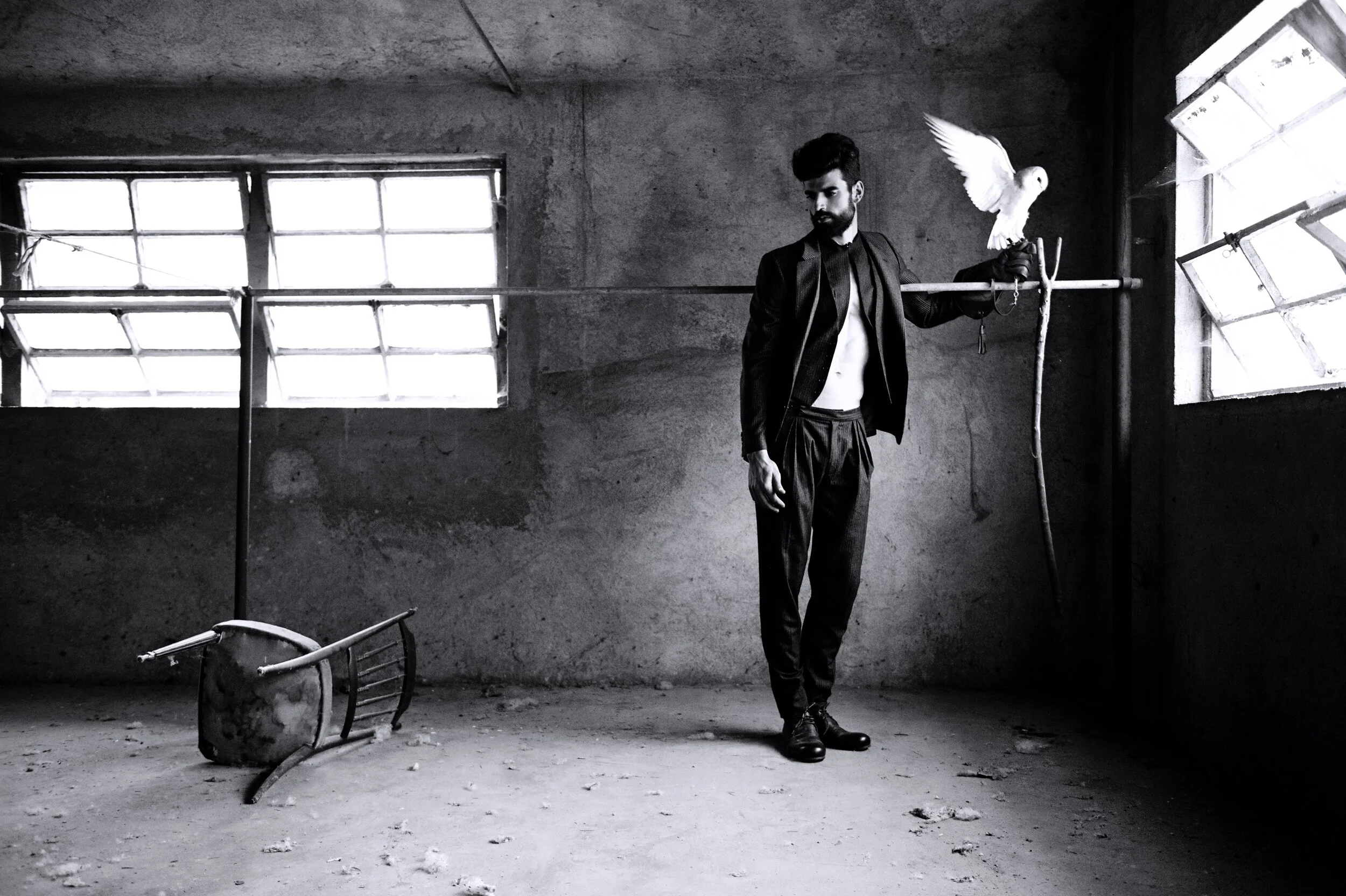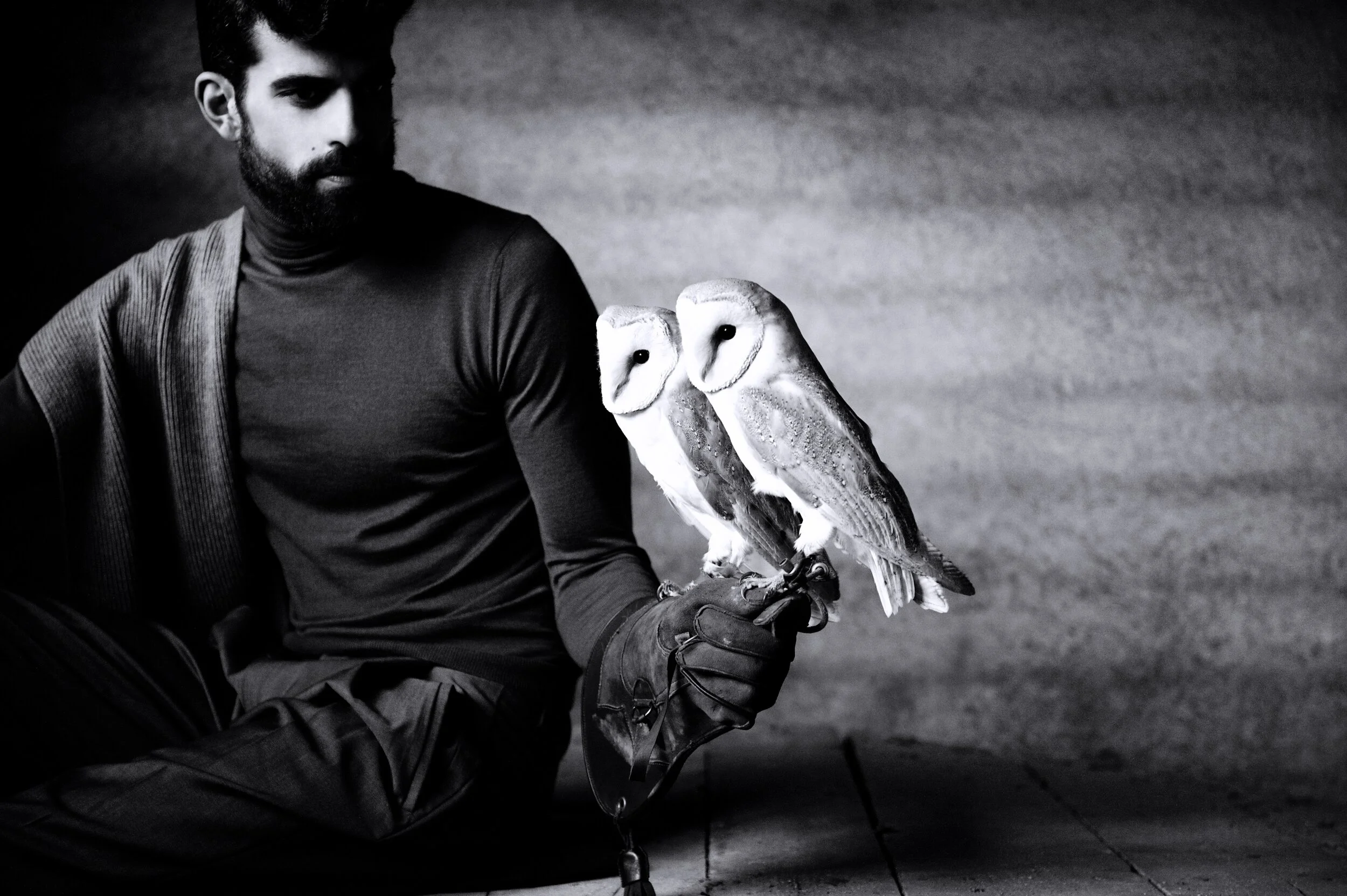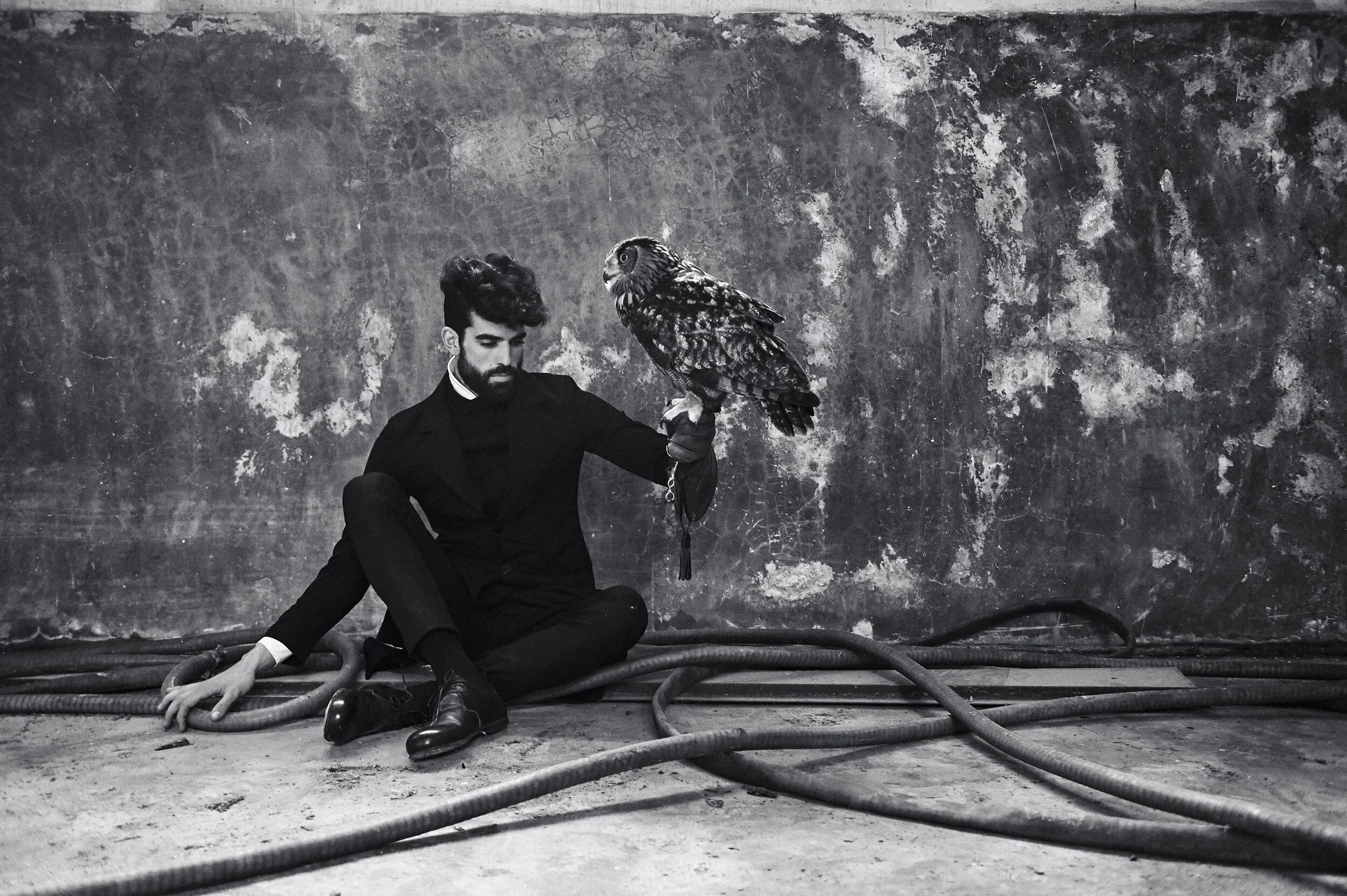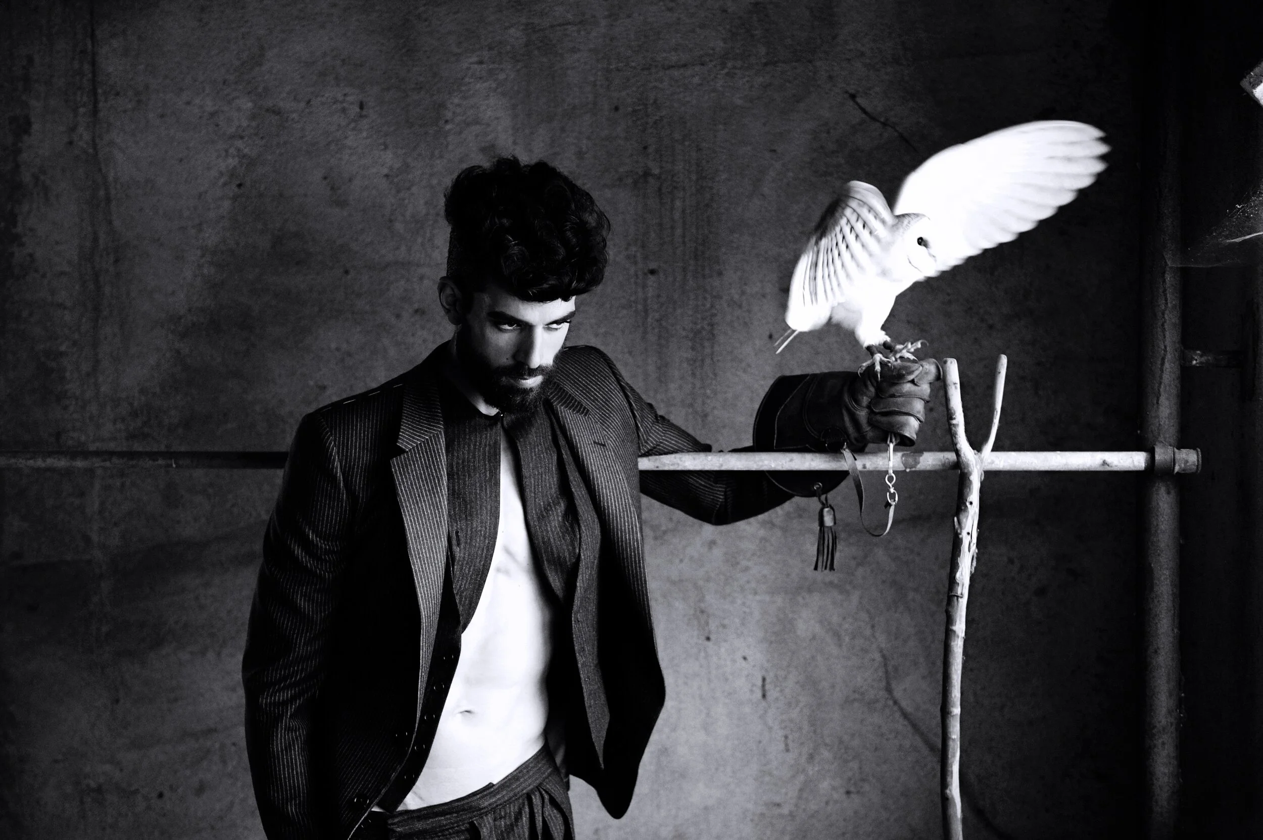 "Finding Solitude" — An editorial for VS. Magazine: Shot on location outside Milan. Three owls were brought in to create contemplative magic with couture pieces.