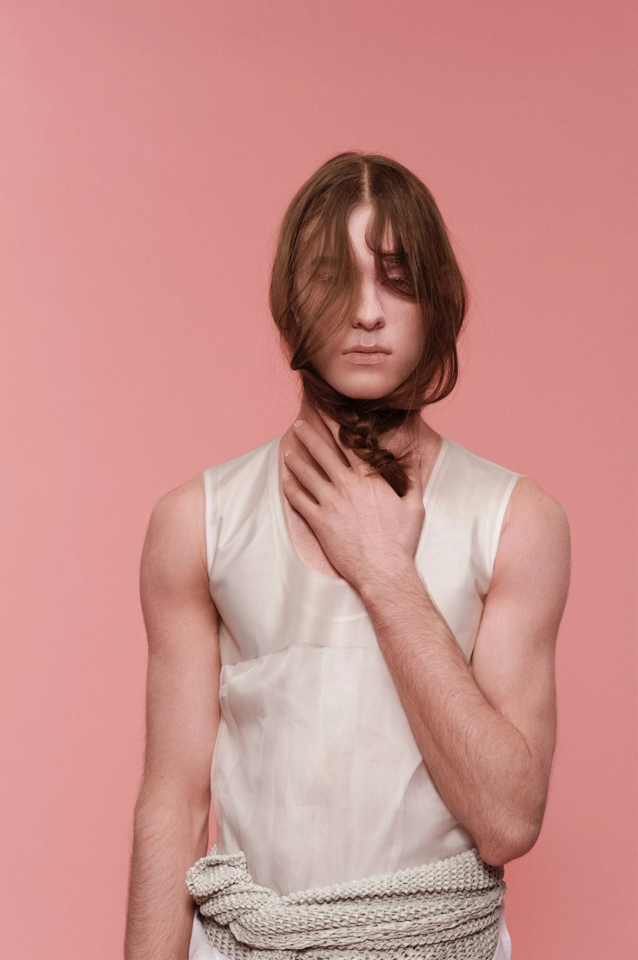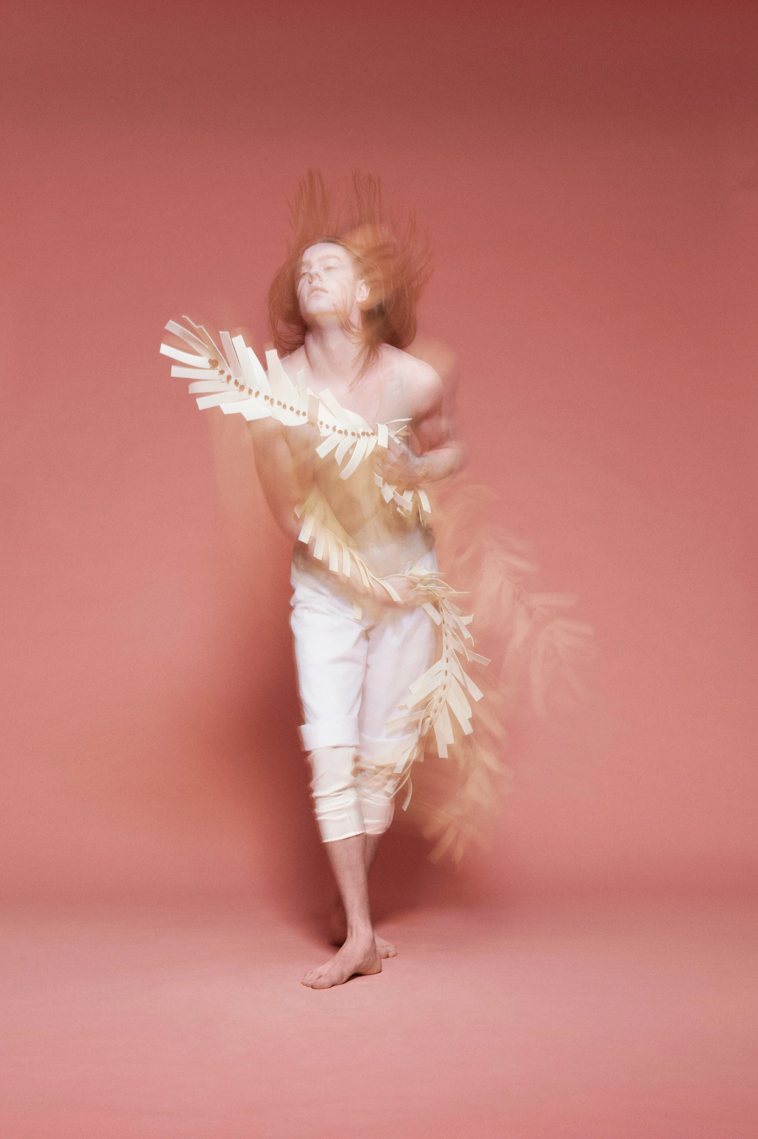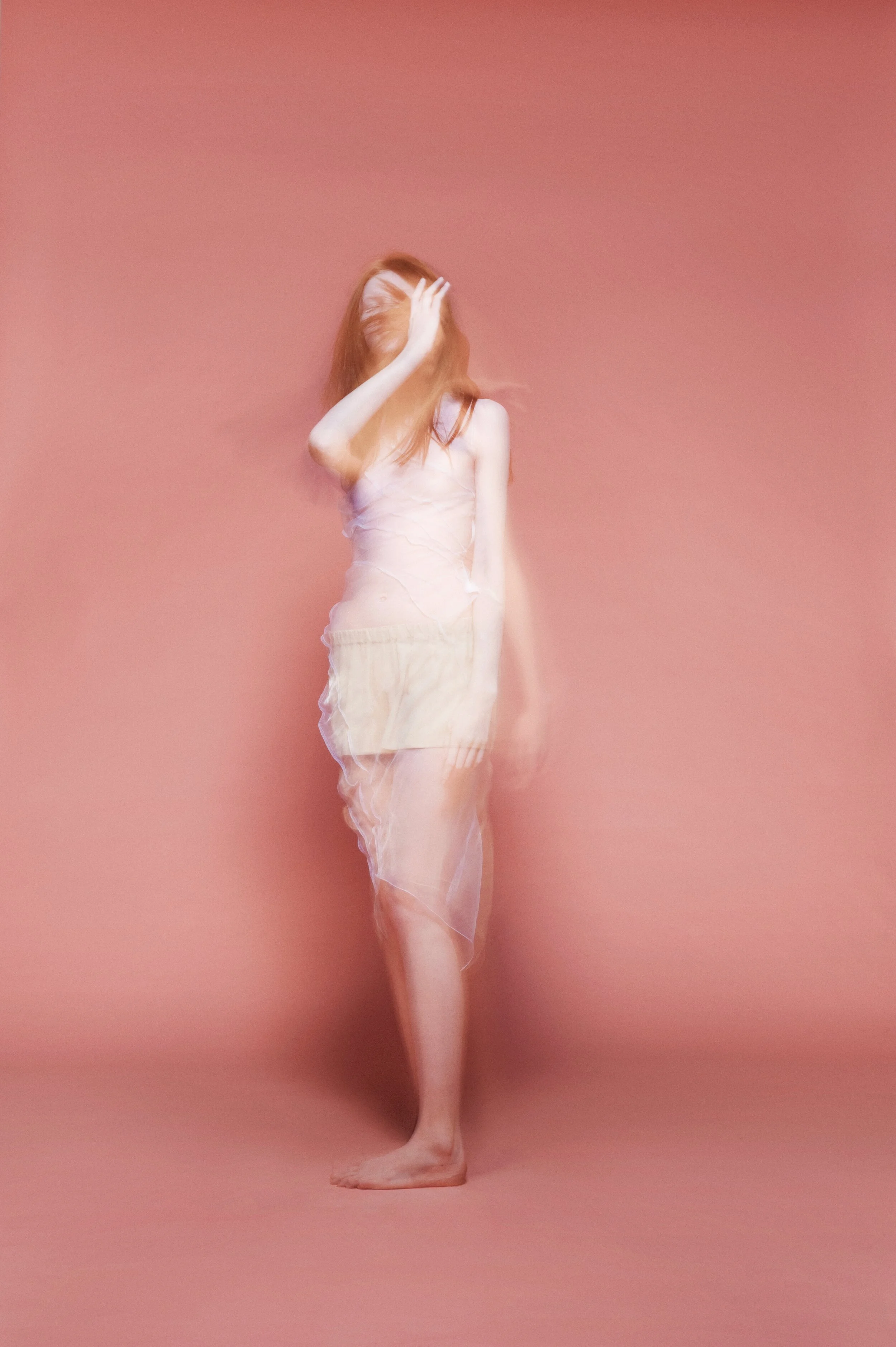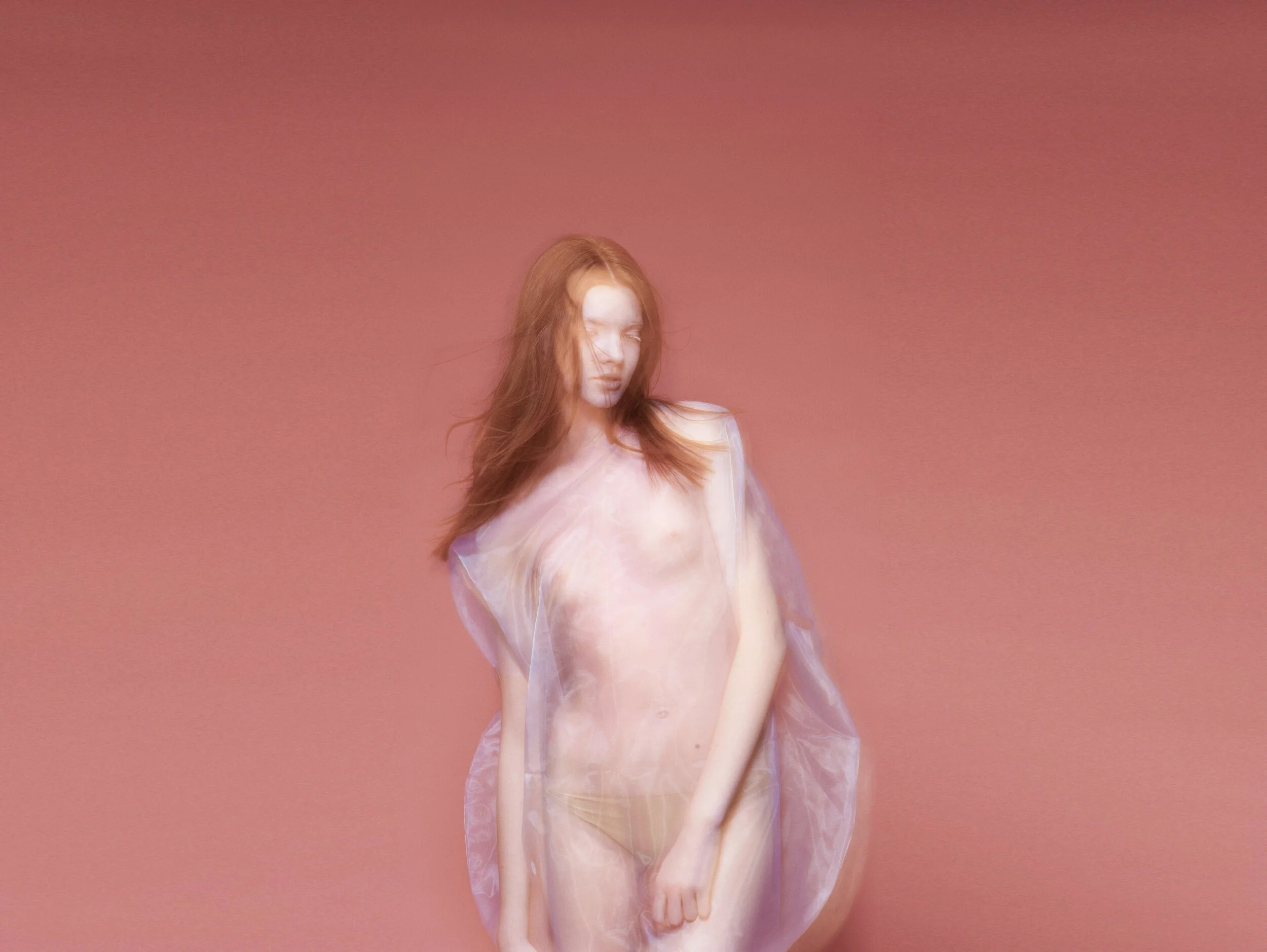 My work for Vogue Italia’s "Talent Shooting" – exploring a more naïve emotion between two people in shared and physical sobriety. They shared a similar look and were cast to dress and interpret the clothes in an almost neutral way, an ambiguous style that does not look for a distinction between genders. They were spray-painted pink and photographed using long shutter times with flash to create a dream-like state.
