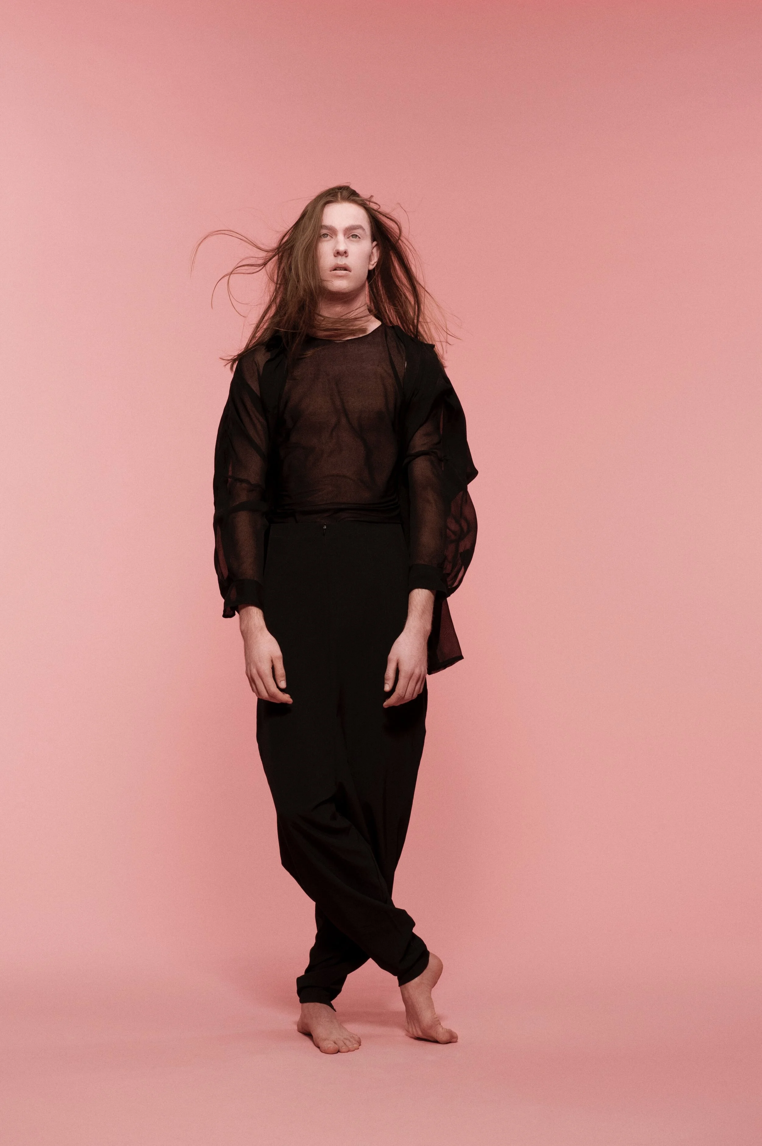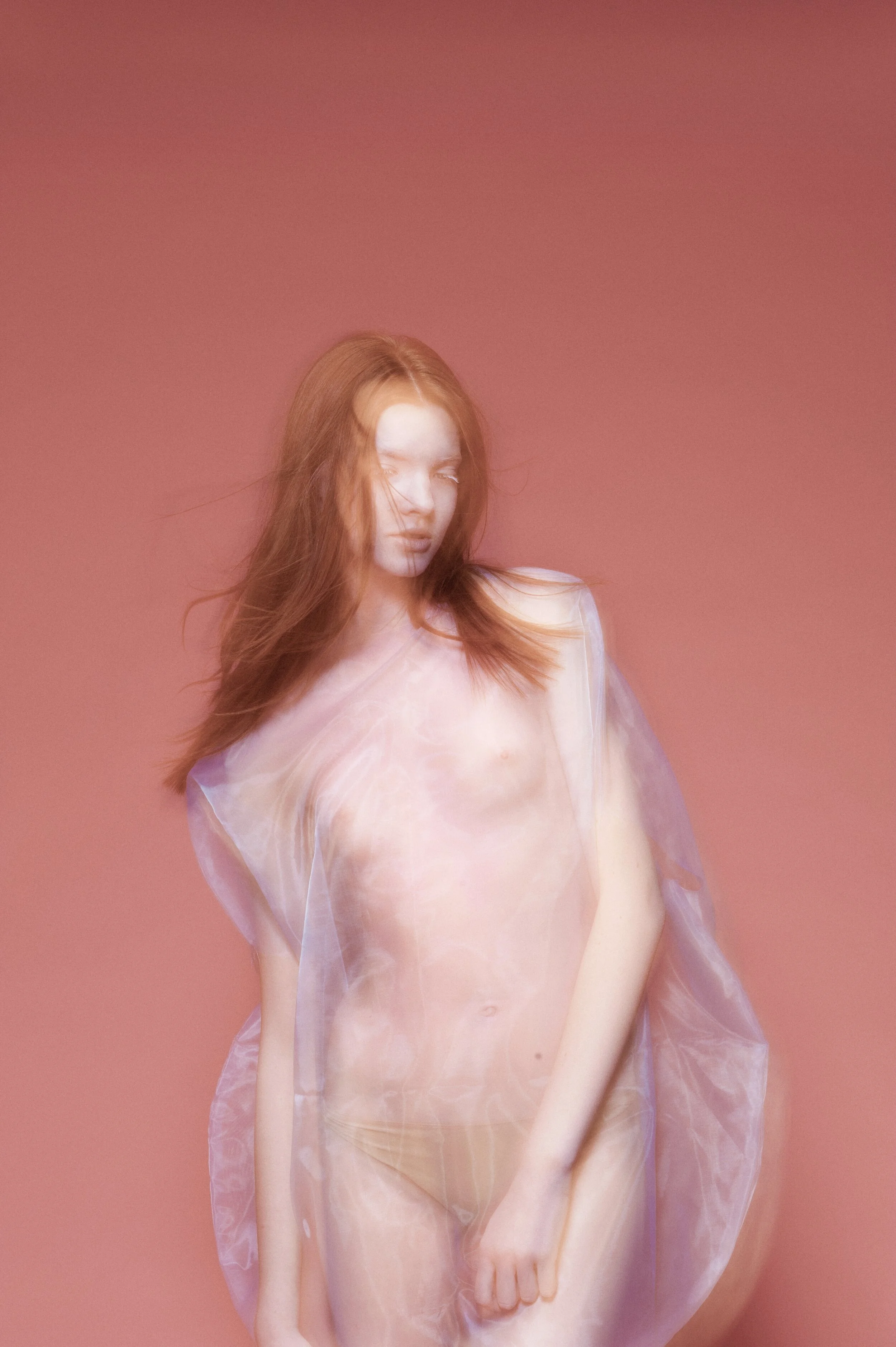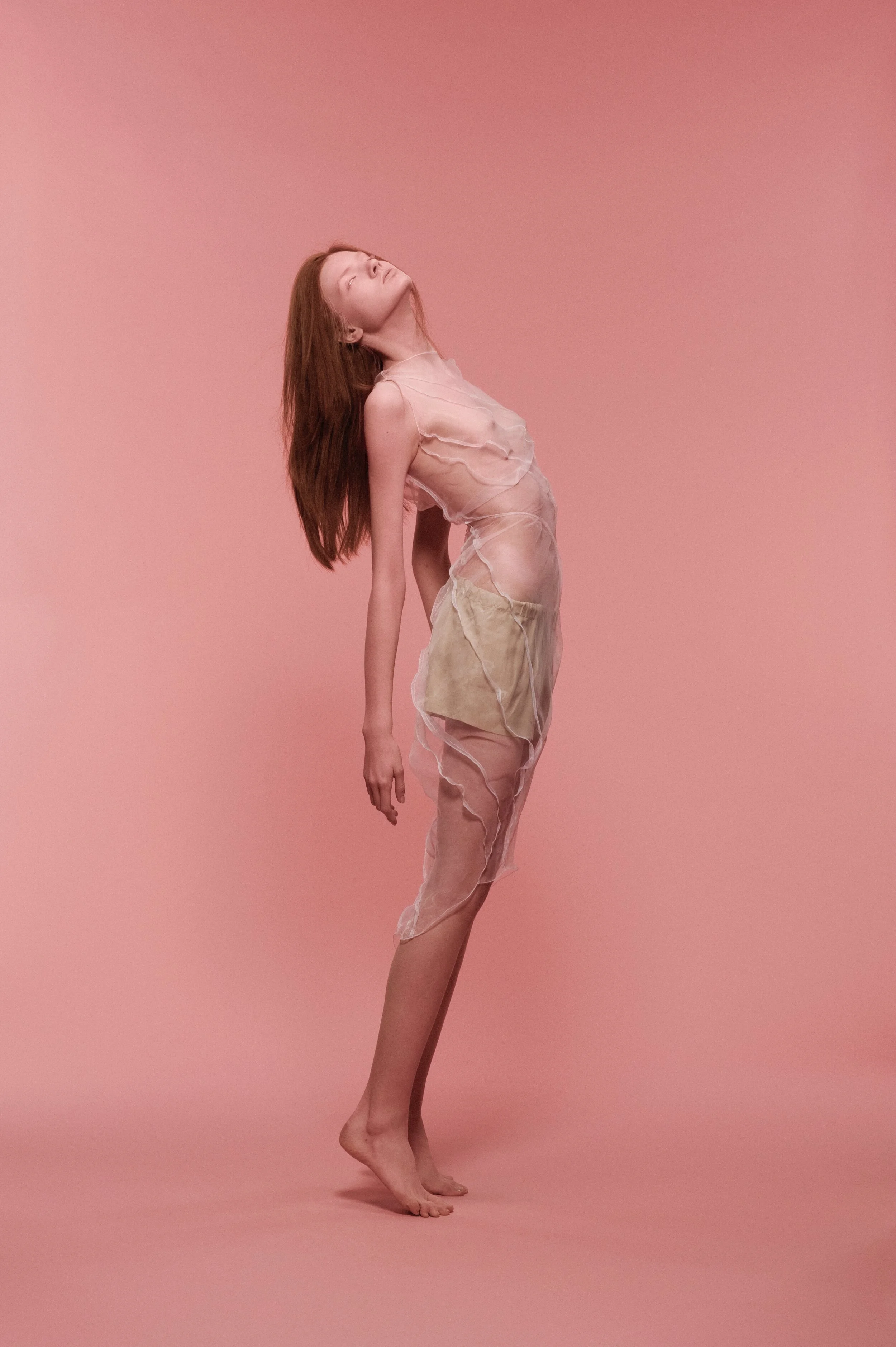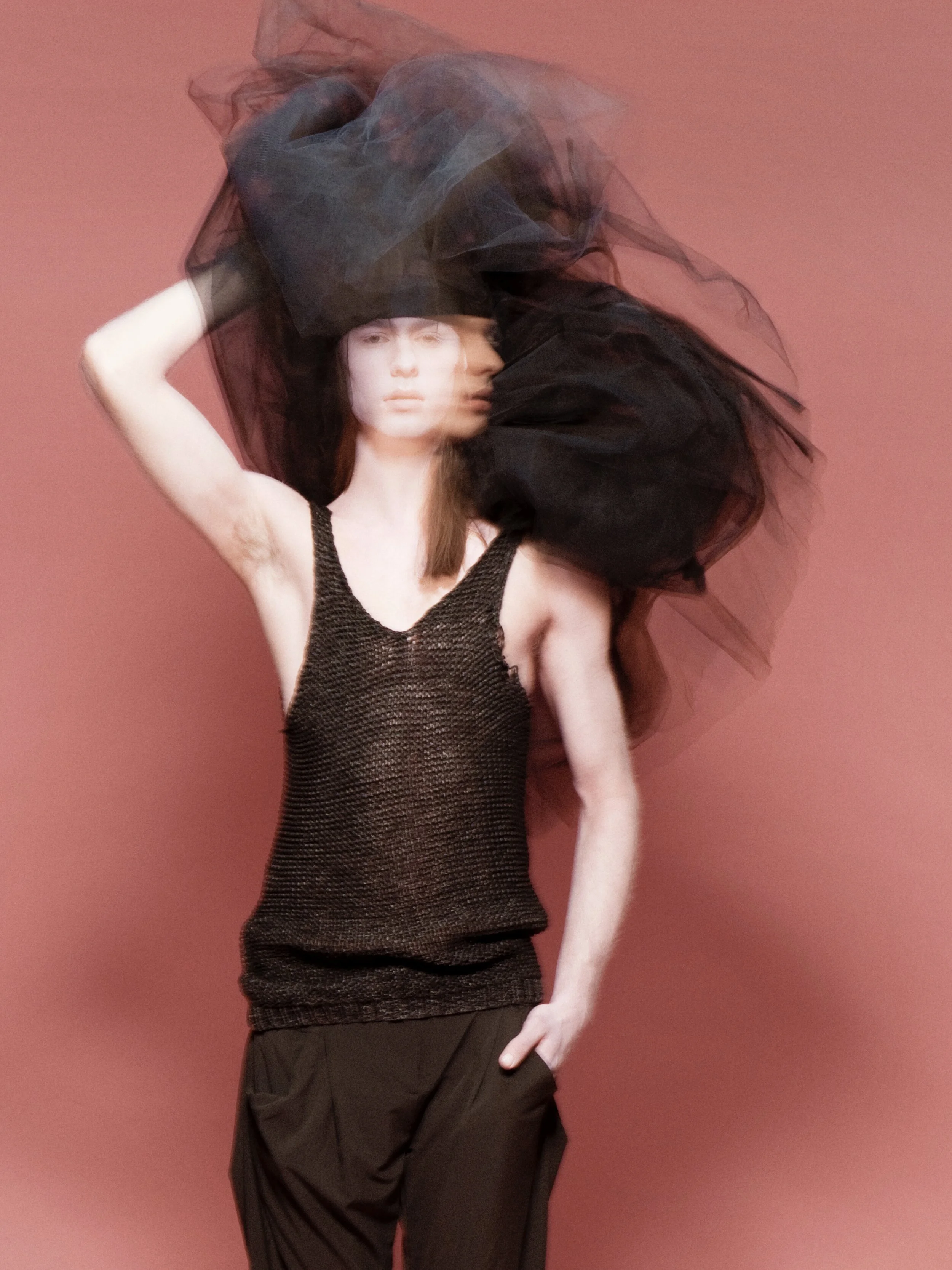 My work for Vogue Italia’s "Talent Shooting" – exploring a more naïve emotion between two people in shared and physical sobriety. They shared a similar look and were cast to dress and interpret the clothes in an almost neutral way, an ambiguous style that does not look for a distinction between genders. They were spray-painted pink and photographed using long shutter times with flash to create a dream-like state.