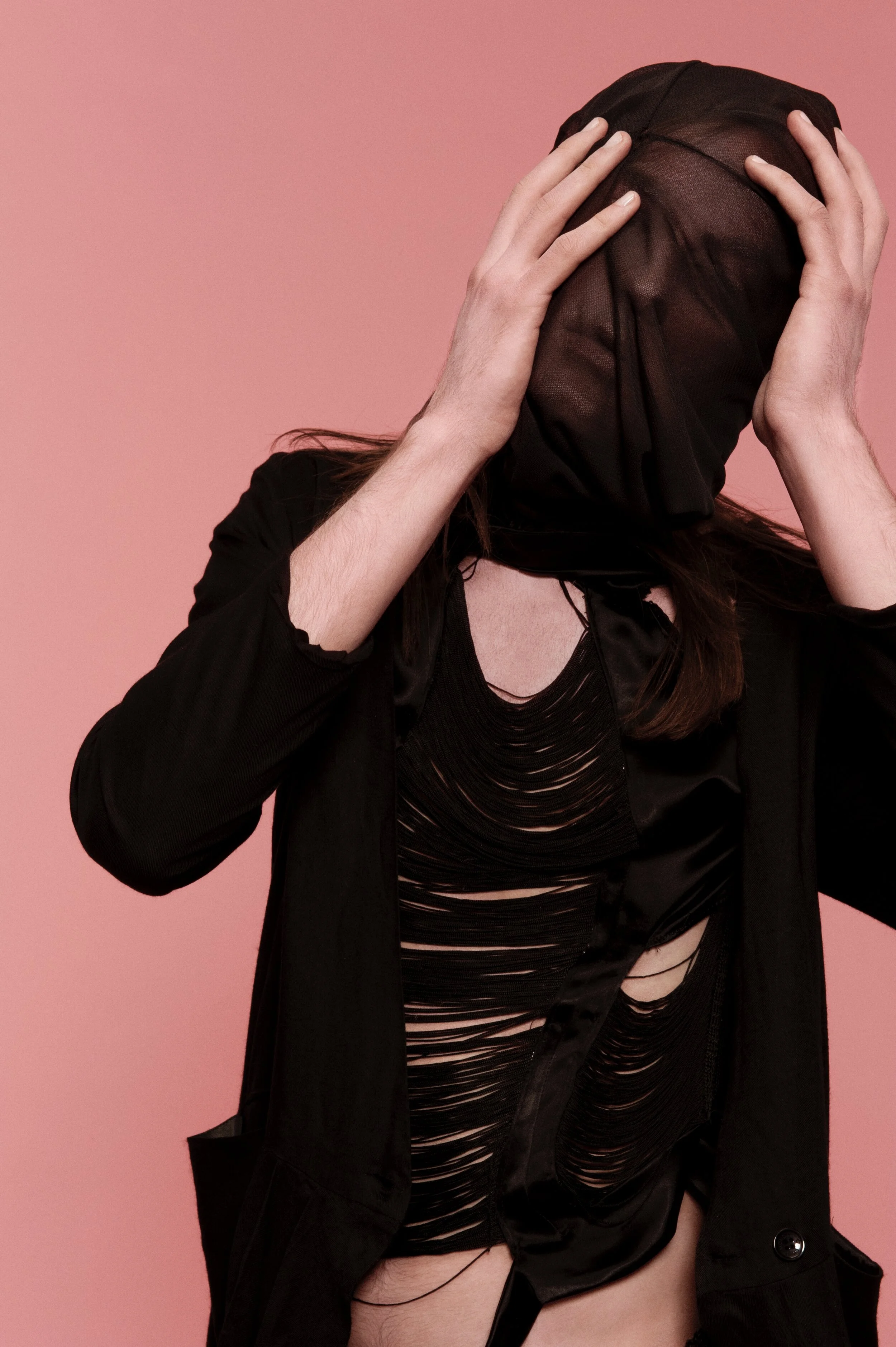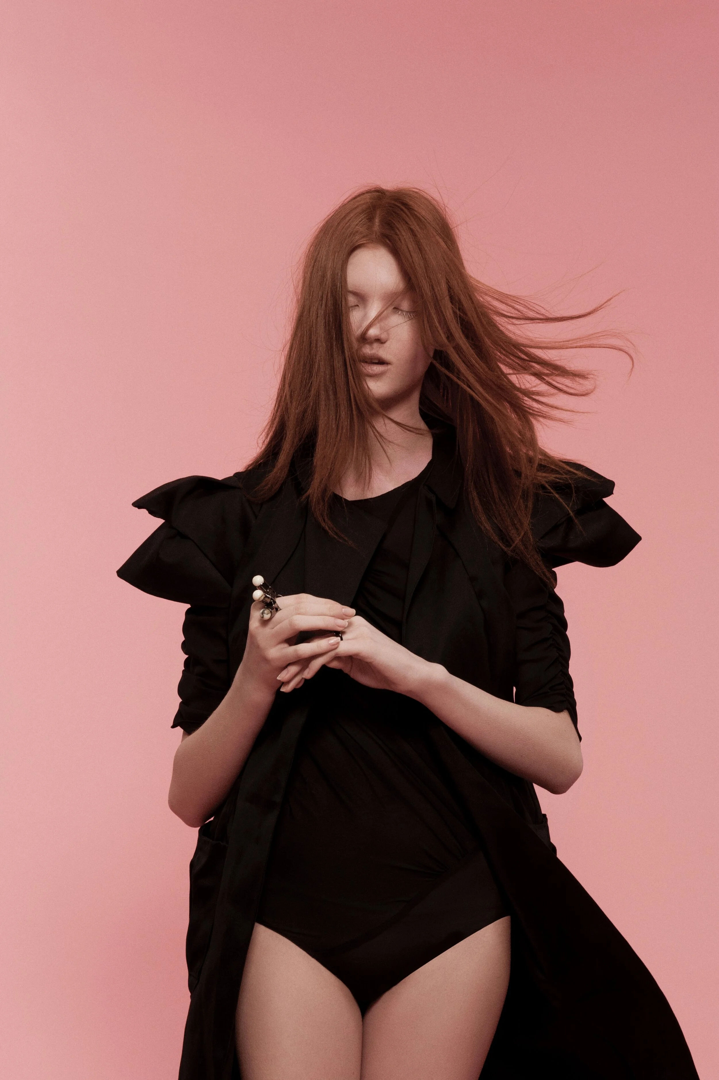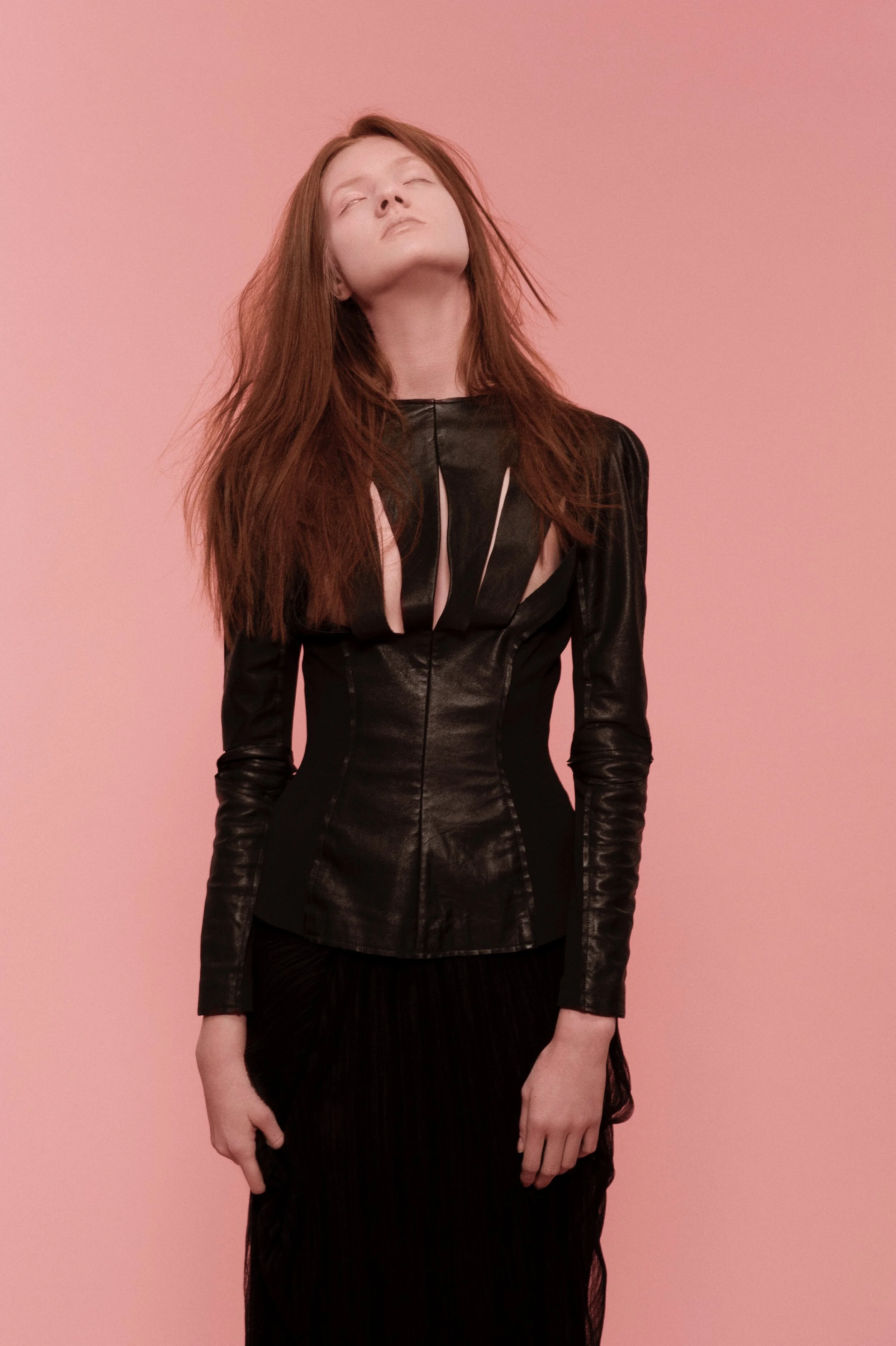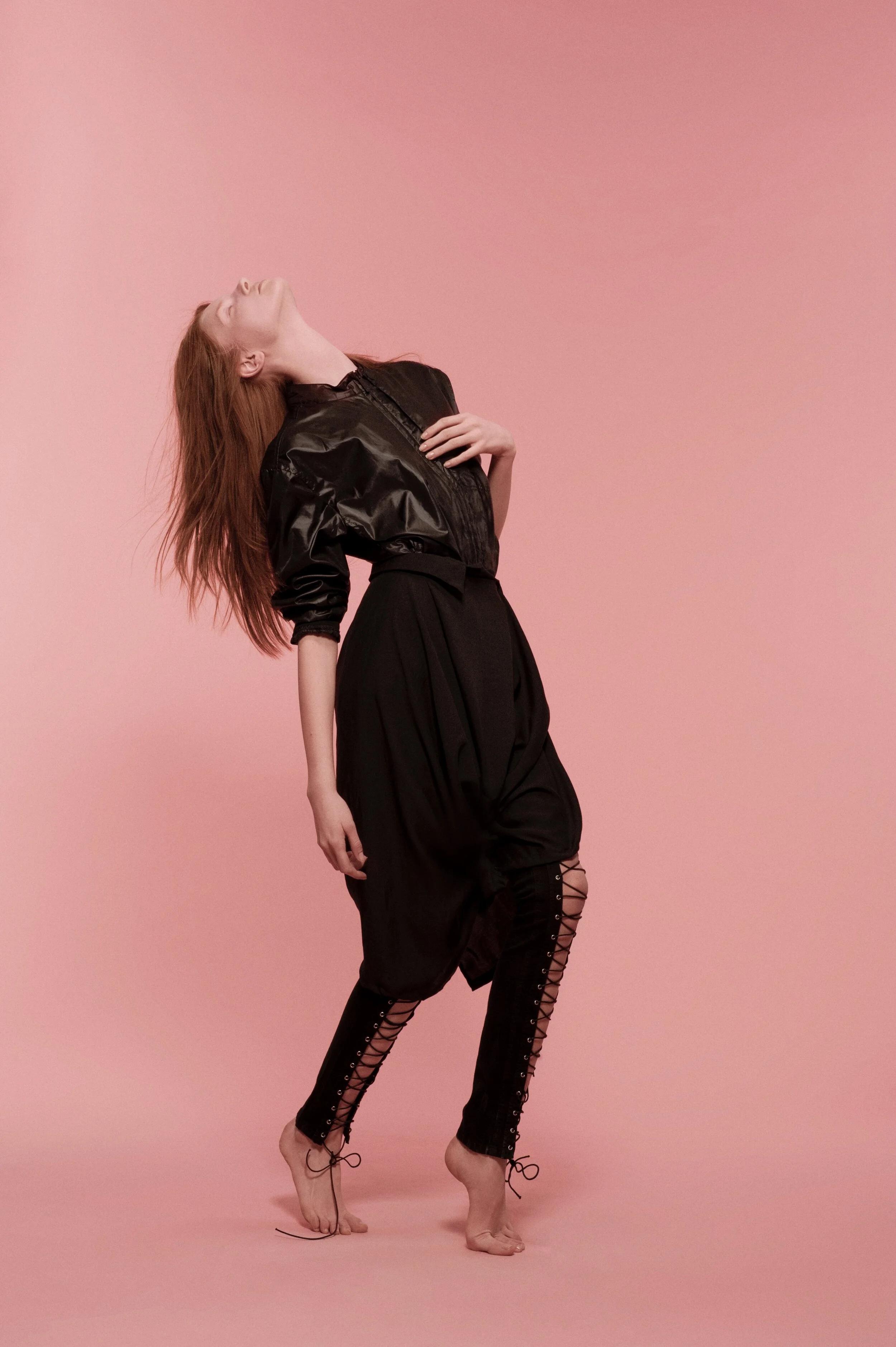 My work for Vogue Italia’s "Talent Shooting" – exploring a more naïve emotion between two people in shared and physical sobriety. They shared a similar look and were cast to dress and interpret the clothes in an almost neutral way, an ambiguous style that does not look for a distinction between genders. They were spray-painted pink and photographed using long shutter times with flash to create a dream-like state.